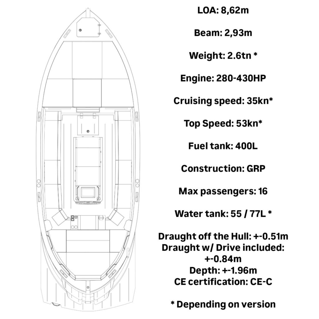 The Speedster’s length of 8.51 meters gives it presence on the water while remaining easy to handle. Storage compartments are cleverly integrated into the design, keeping the deck clear and safe. The helm is equipped with modern navigation systems, placing control and information directly at hand. Every element reflects the craftsmanship and attention to detail that define Dutch boatbuilding.
